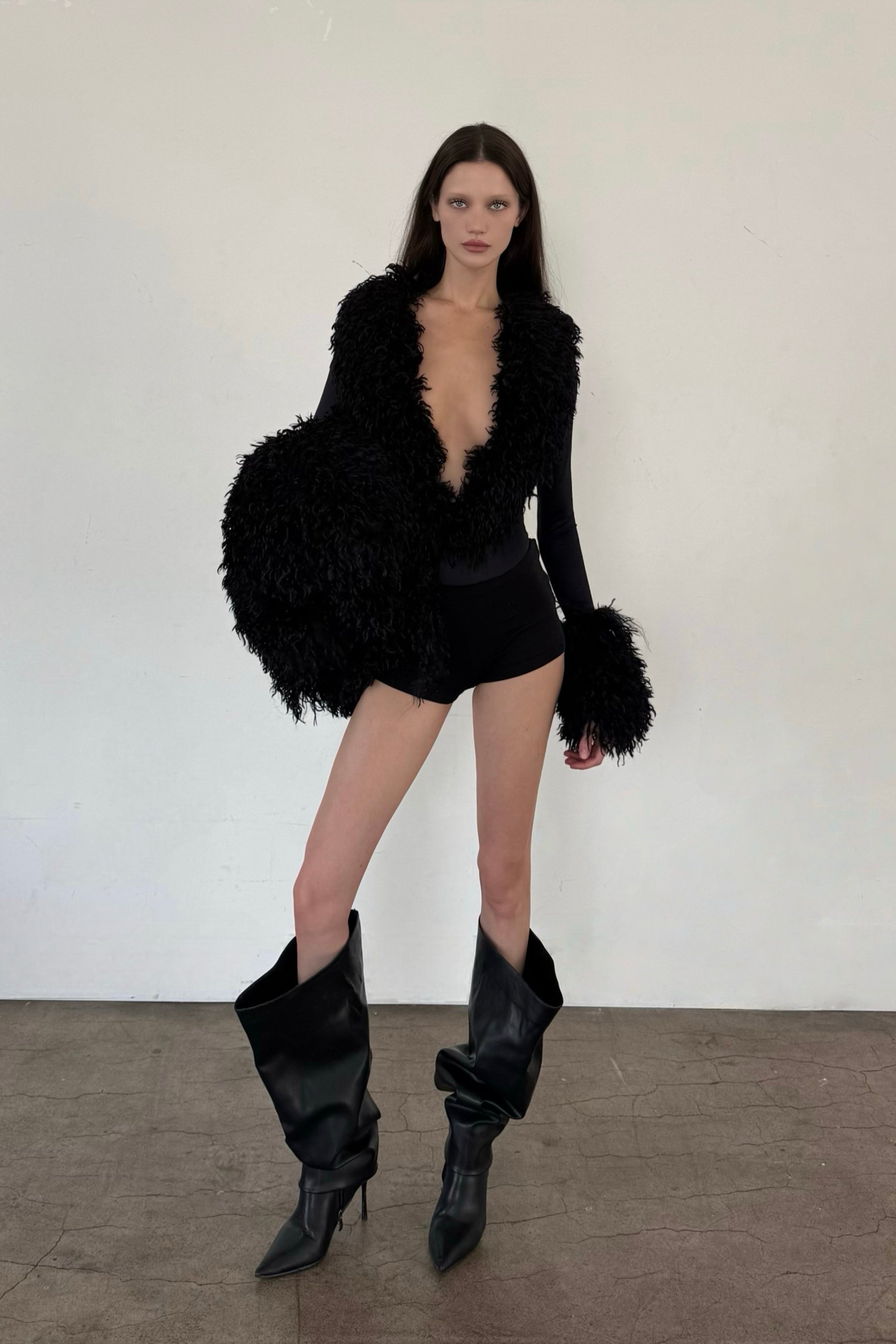 Solara - the radiant counterpart to Lunaris, embodying the light of dawn after the lunar night. A black plunge bodysuit accented with oversized plush fur lapels and sleeves paired with a fold over shorts, capturing the soft glow of first light